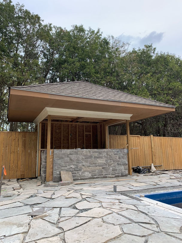 Installed a new pool house exterior using Maibec board and batten siding, V-Joint pine ceilings, and aluminum soffit, fascia, and eavestrough.