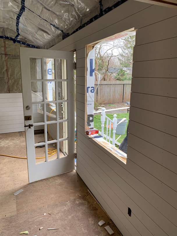 Designed and renovated a garage into a garden studio, installed tile, BC fir custom-built trellis, James Hardie lap siding, and James Hardie soffit and fascia.